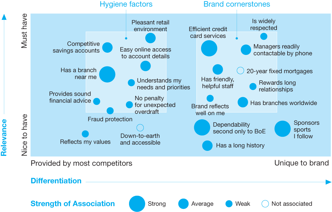 In order to create focused relevant messaging, we distil the four value creating dimensions of the brand into hygiene factors (benefits that must be provided for the brand to be considered) and differentiators (benefits unique to the brand). These are then condensed further into 5 or 6 core attributes or brand cornerstones. Finally, these elements are used to generate an overall positioning concept that summarises everything the brand stands for in a single idea or expression. This process of refinement creates a hierarchy of selling messages based on both tangible and intangible features and benefits.