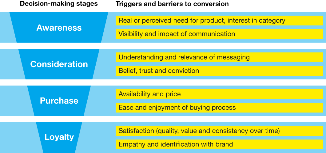 Our core problem-solving tool is the purchase funnel which is used to understand where customers are in their decision-making process. There are four core stages with various triggers and barriers influencing purchase intent at each one.